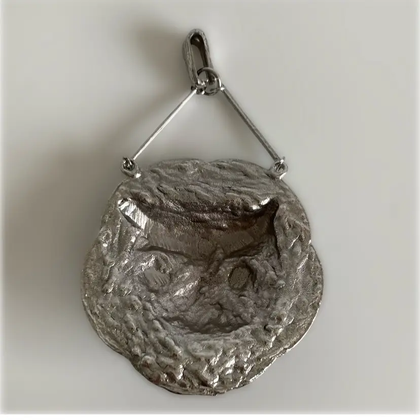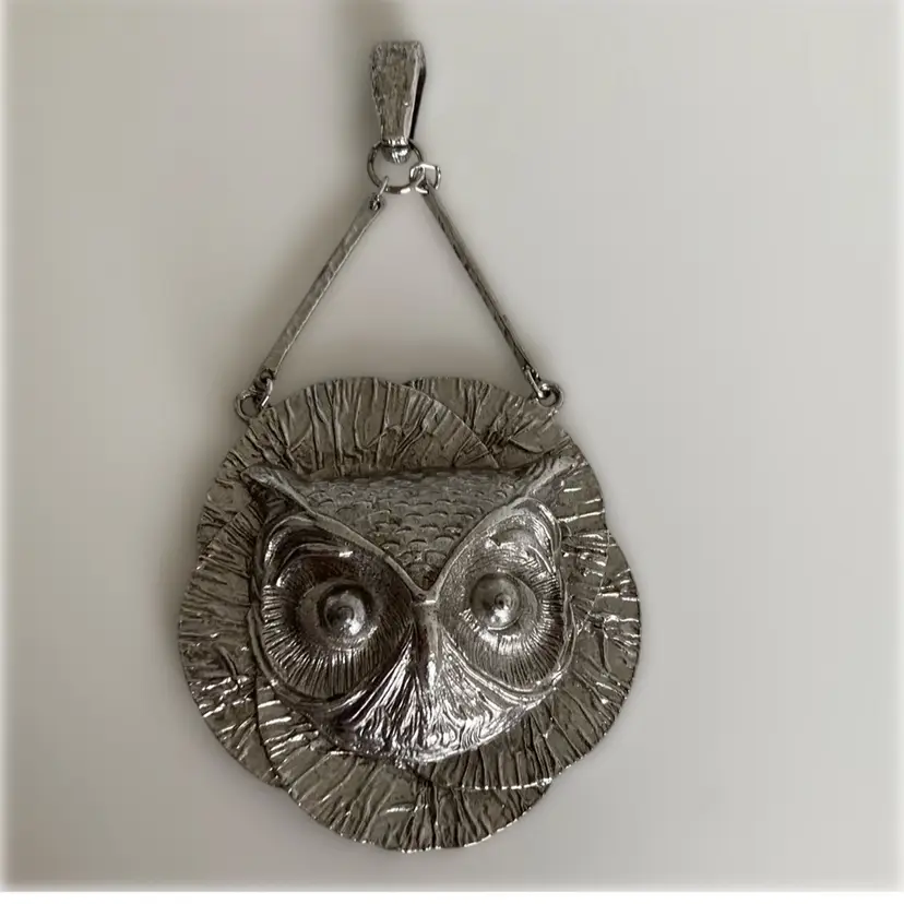 1970’s Brutalist silver tone owl pendant. It measures 3” across and hangs about 5”.