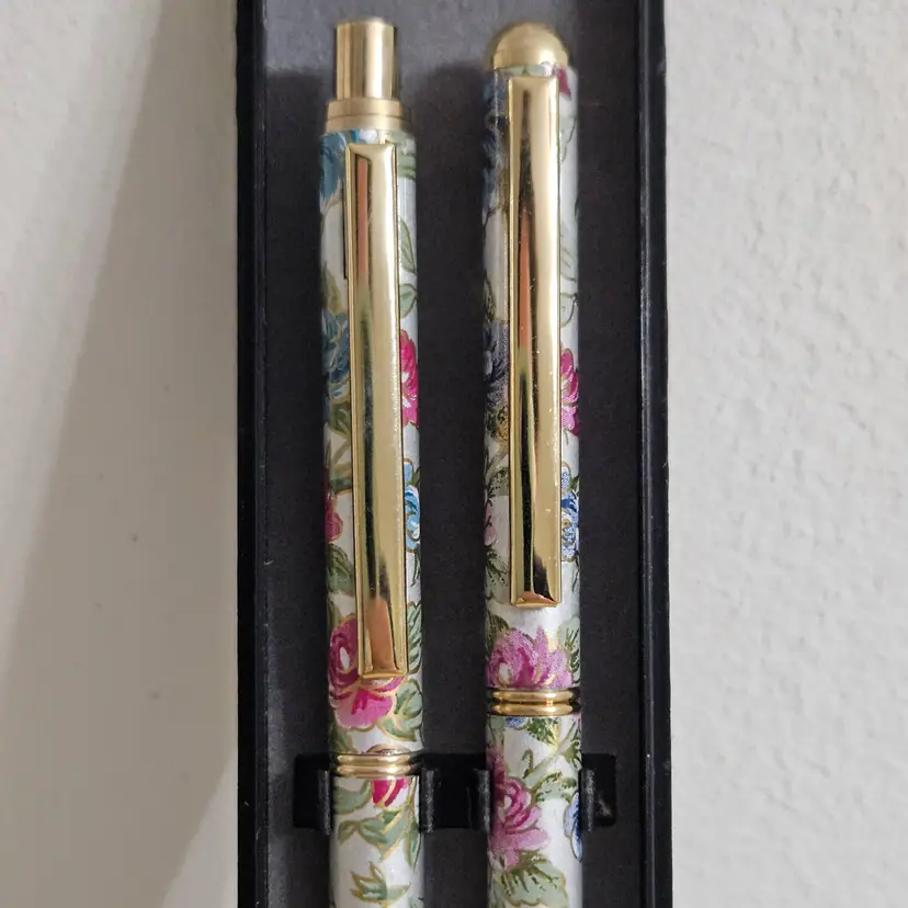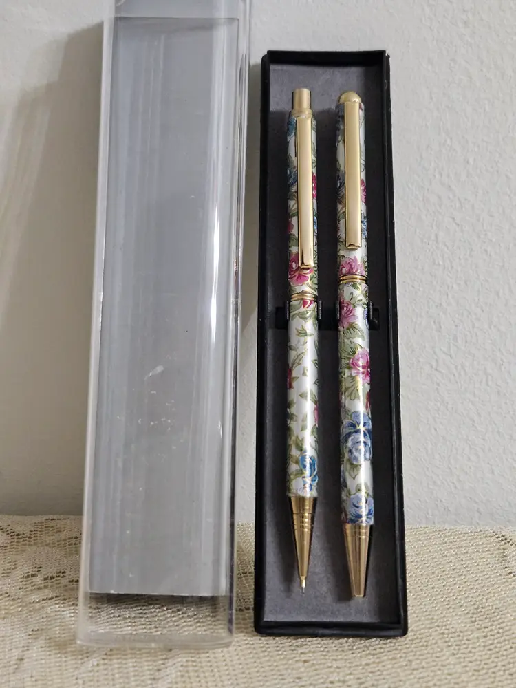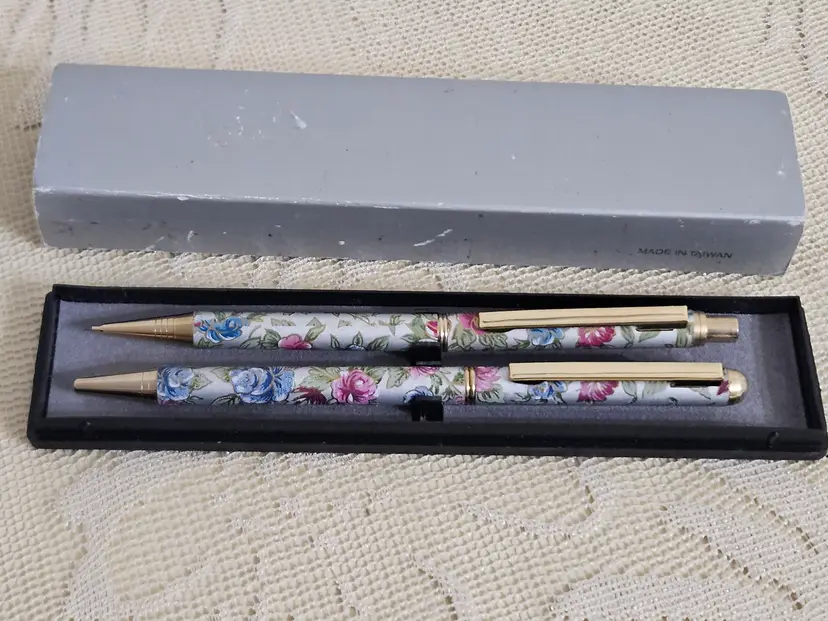 Beautiful writing set with pink, blue, green floral design & silver/gold tones. Made in Taiwan.